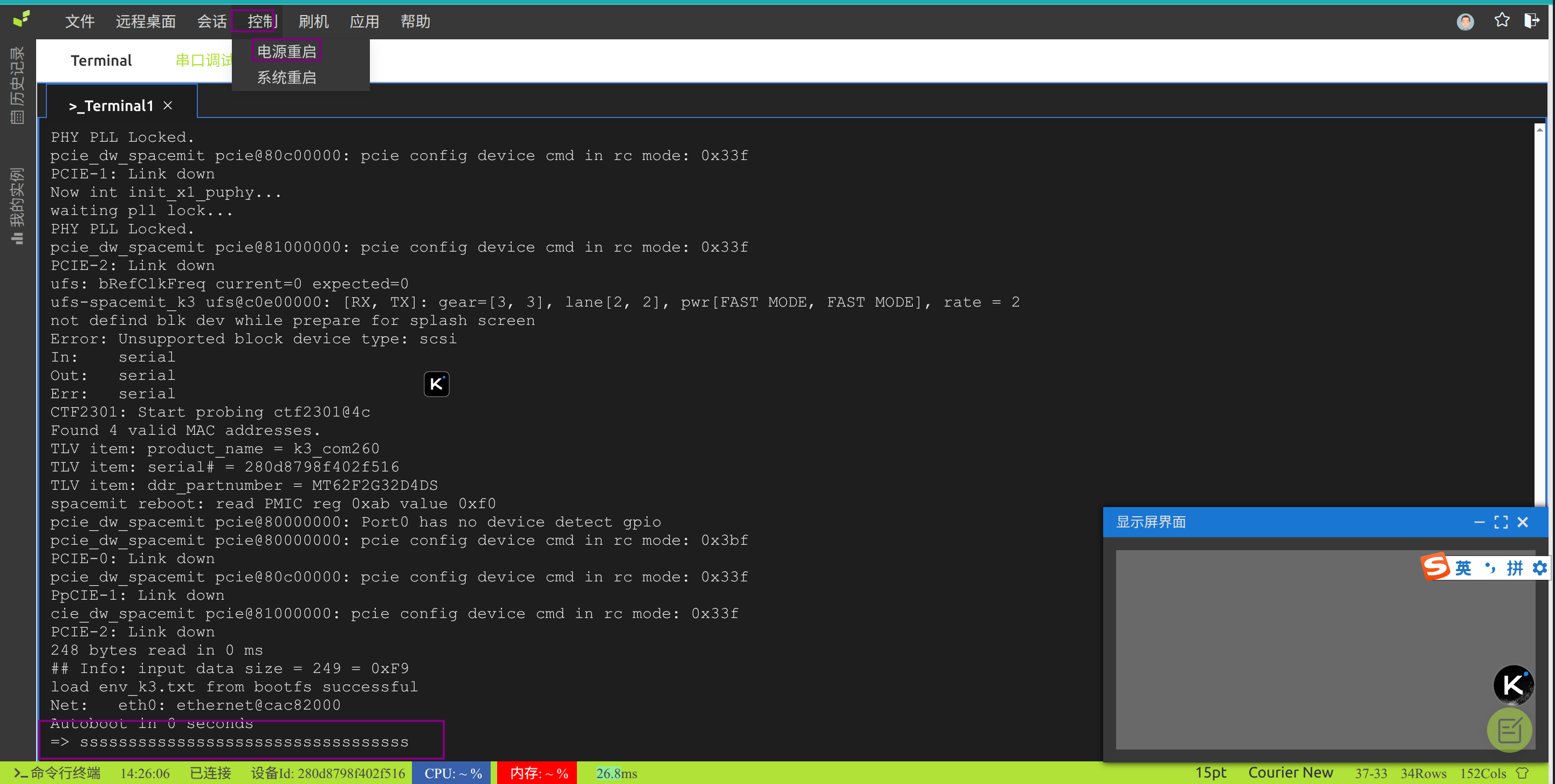 注意,系统检测到10分钟没有启动就会自动重启,因此在uboot终端要操作快一点。