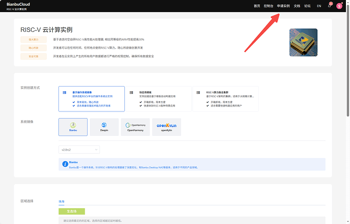 在右上角导航栏点击 申请实例,进入申请页面。