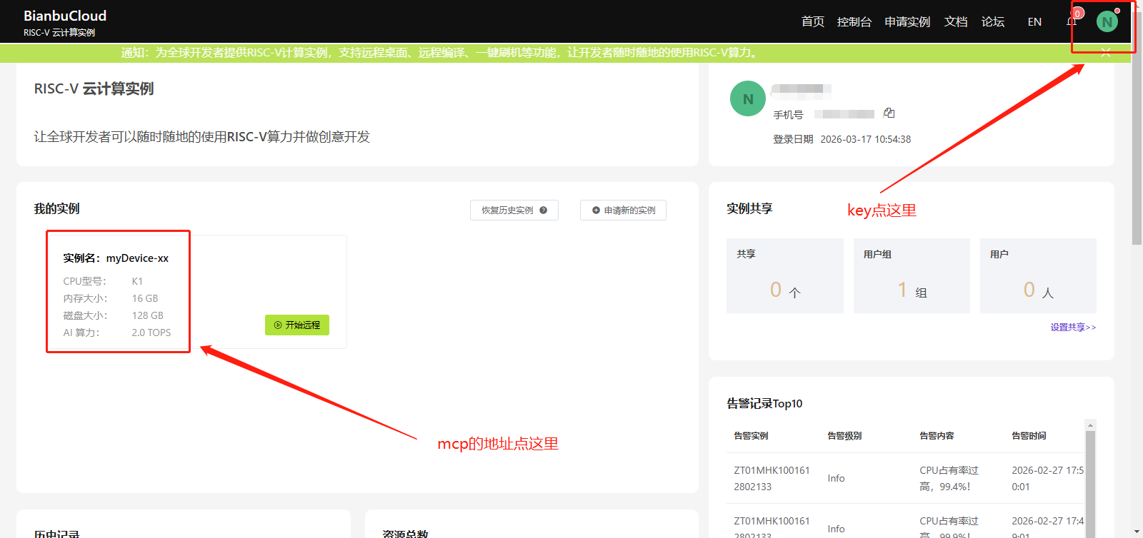 先在 Bianbu Cloud 控制台点击自己的实例卡片,进入实例详情页。