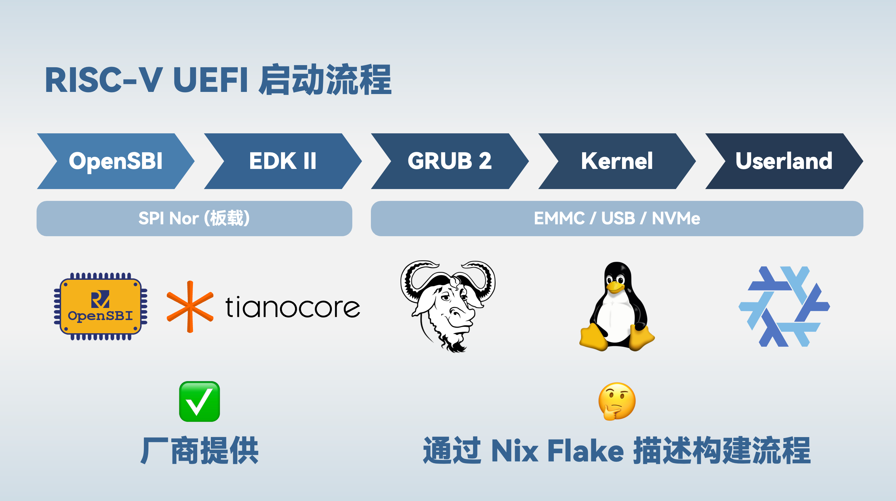 图中展示的是 RISC-V UEFI 启动流程。其中 OpenSBI 和 EDK II 已经由厂商提供,烧写在板子的 SPI nor 介质上。EDK II 可以提供一个标准的 UEFI 环境,因此我们不需要定制这一部分。