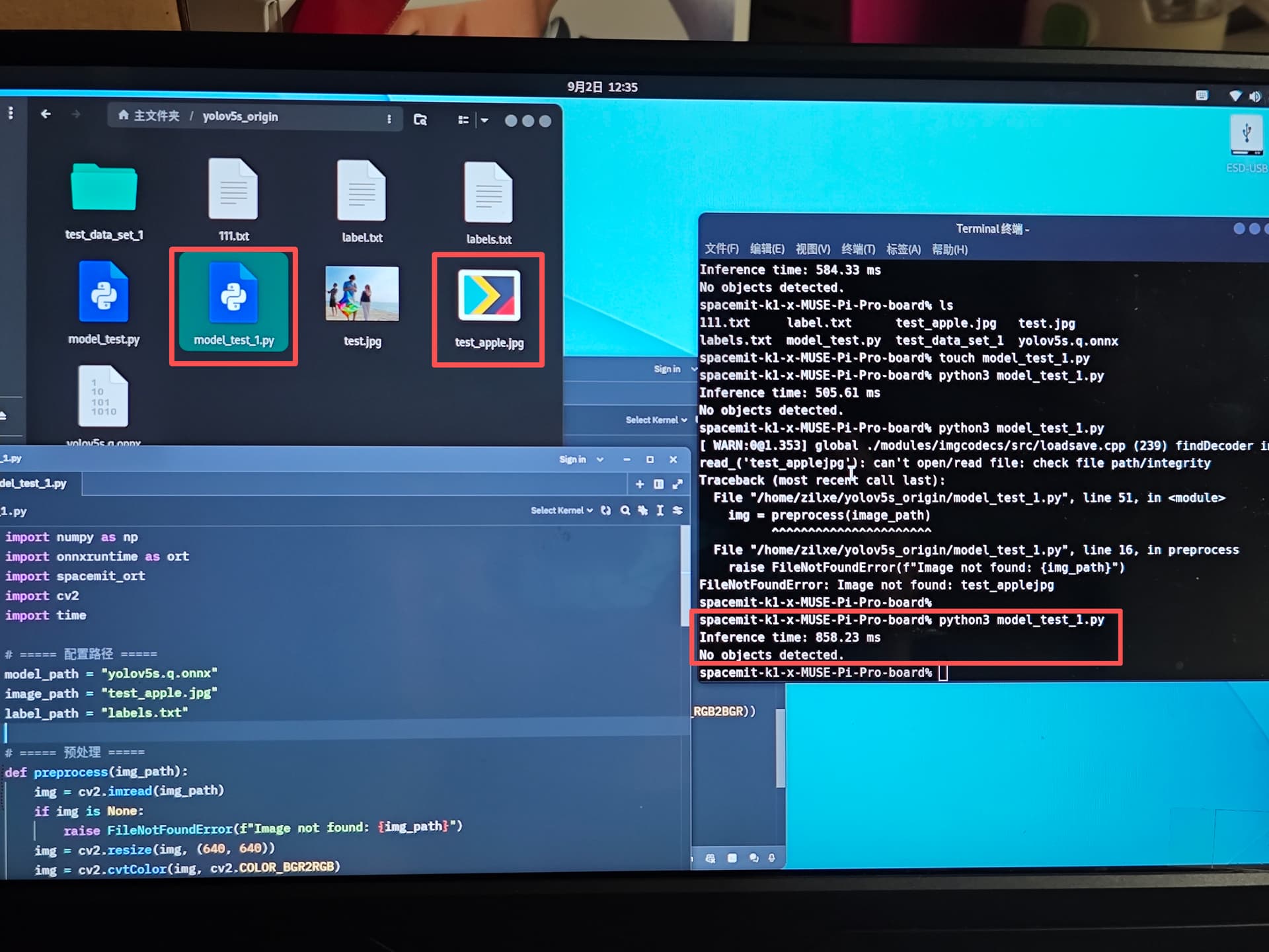 你好,我在板子端的学习平台内根据onnxruntime部署模型的参考文献作为参考,去改写yolov5s.q.onnx的部署检测目标代码时运行显示检测不到目标,这是为什么,我的test中显示的物体在label中也表明了分类,如我所写的test_apple.jpg在label中有对应的apple,但是检测不到目标。