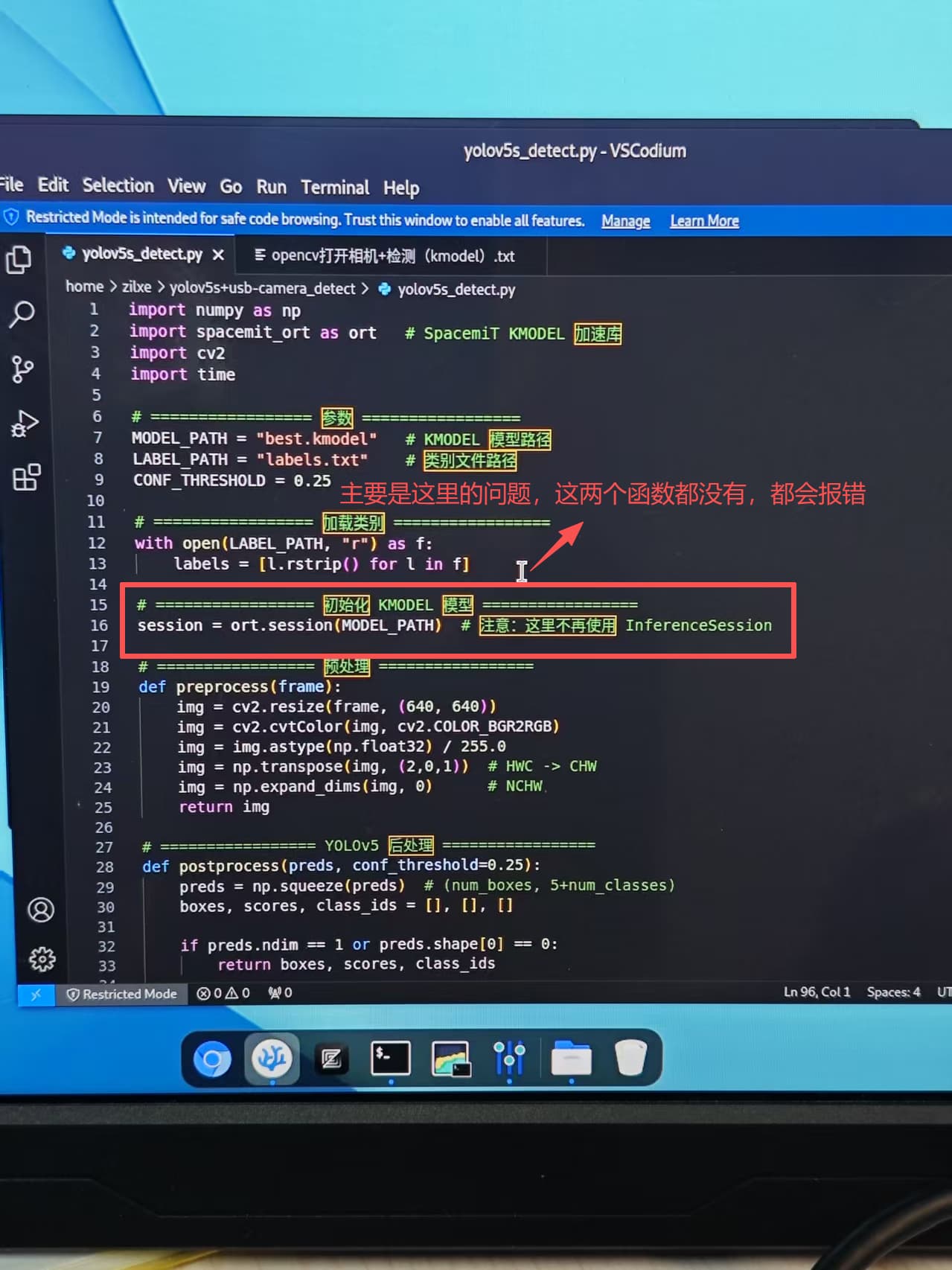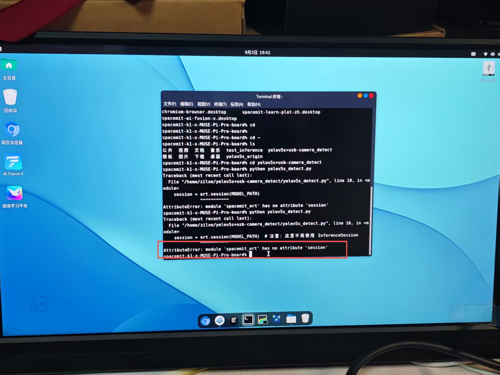 你好你好,抱歉我的问题有点多,还希望你能耐心回复,我试过用best.q.onnx 去部署在板子上,opencv打开摄像头没问题,推理时间也显示在弹窗的左上角,但是就是没有检测框以及检测类别的出现,训练时的yaml和我的labels一致,已经检查过,现在我把q.onnx 模型转换为了kmodel模型,(我使用的是python to_kmodel.py --target k230 --model …/…/runs/train/exp3/weights/best.onnx --dataset …/test --input_width 640 --input_height 640 --ptq_option 0 命令),但是实际运行时终端打印出: module’spacemit_ort’ has no attribute’session’ 错误,我查看了spacemit-ort版本号为1.2.2,官方所给的推荐部署kmodel模型是稳定版本要求为2.x版本以上,请问我怎么升级spacemit-ort以保证我可以解决这些问题呢,希望你可以给我两种方案:(1)还是继续使用q.onnx量化模型去推理(2)使用komdel模型去推理,我要怎么升级我的spacemit-ort的版本,很抱歉一直这样打扰你,但是真的比较急,谢谢!