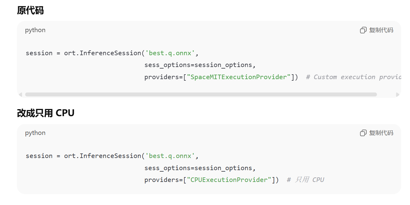 关闭spacemit硬件加速就是把代码修改成这样吗,我用cpu和spacemit硬件加速运行打在终端的结果是一样的,救命,另外我可能还需要补充的是,我修改好了代码,运行在终端的结果如下图