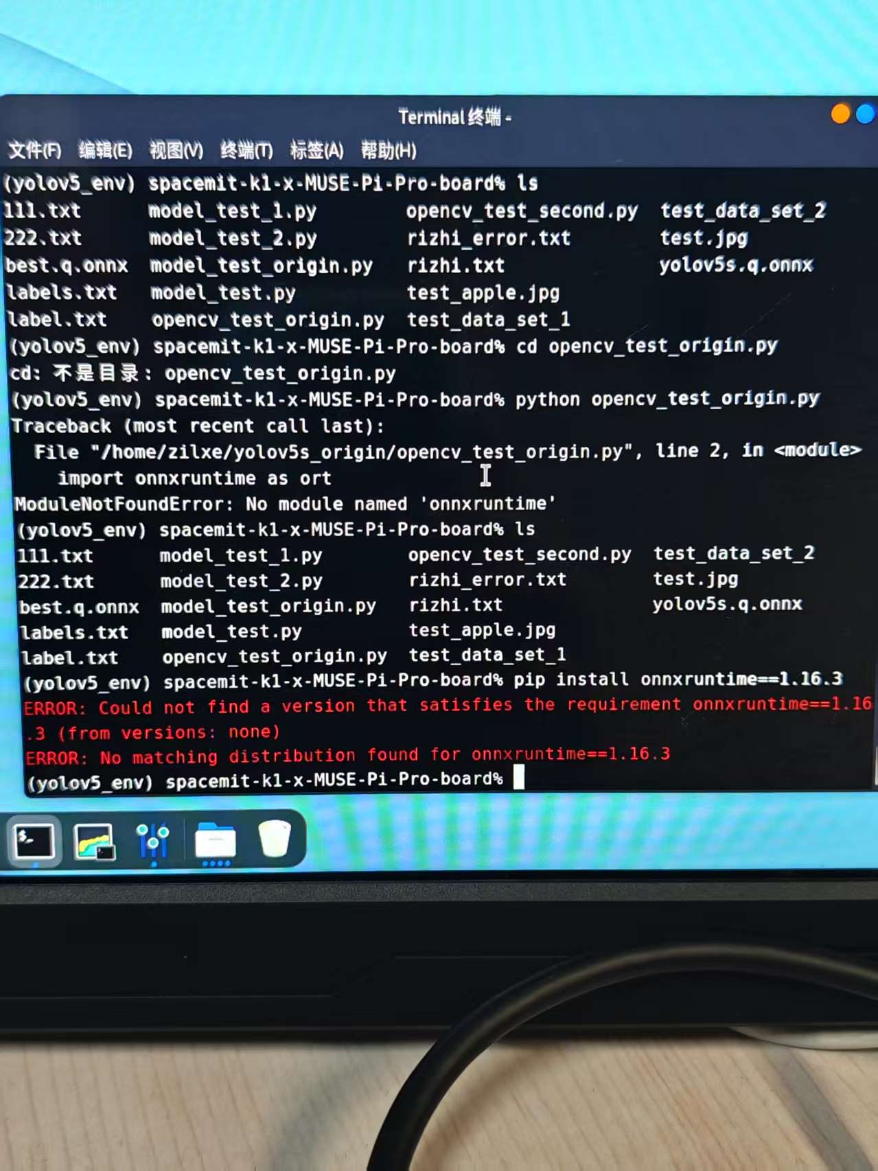 你好,我的全局环境spacemit-ort 版本是1.2.2,我新建了虚拟环境按照你给我的下载命令来进行安装spacemit-ort的最新版本,我在全局变量pip show spacemit-ort可以打印出版本,pip show onnxruntime 显示没有该模块,但是运行时使用onnxruntime的话不报错,不会显示说没有模板onnxruntime,但是我在虚拟环境中安装spacemit-ort.2.0.0 beta1版本,pip show spacemit-ort可以打印出版本,同样pip show onnxruntime 显示没有该版本,但是运行同一个程序需要onnxruntime时会报错,显示没有module ‘onnxruntime’,我尝试单独使用pip install onnxruntime==1.16.3报错ERROR: Could not find a version that satisfies the requirement onnxruntime==1.16 .3 (from versions: none) ERROR: No matching distribution found for onnxruntime==1.16.3。