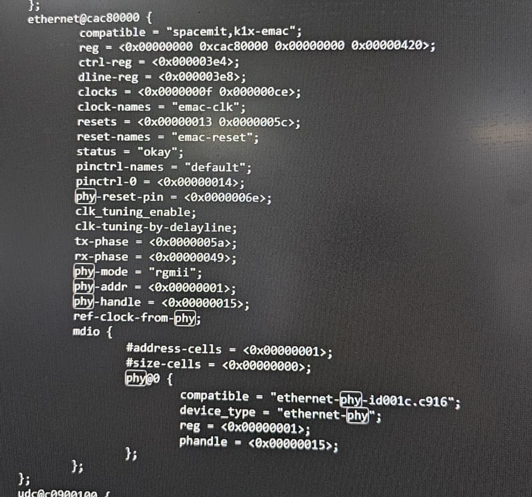 【问题】设备树里读出来 mac基地址0xcac80000,phy号为1,但是去扫描phy操作读它的第二位第三位寄存器,一直读的都是0,读不到正常数值?是不是基地址不对?我扫了很多phy号都读不到正常值,而且操作各个寄存器读写也操作不了。