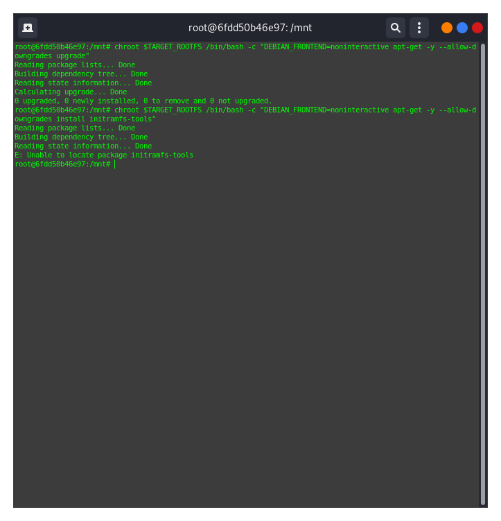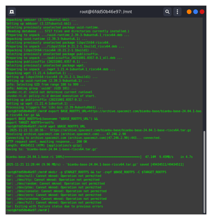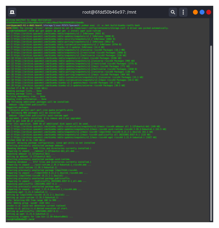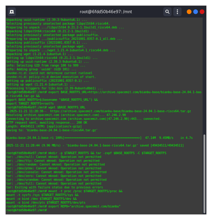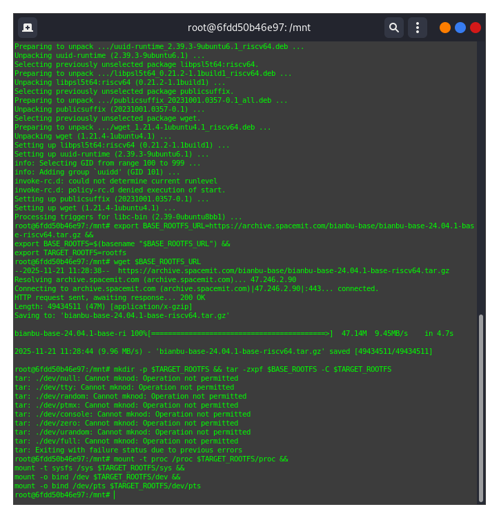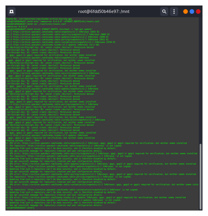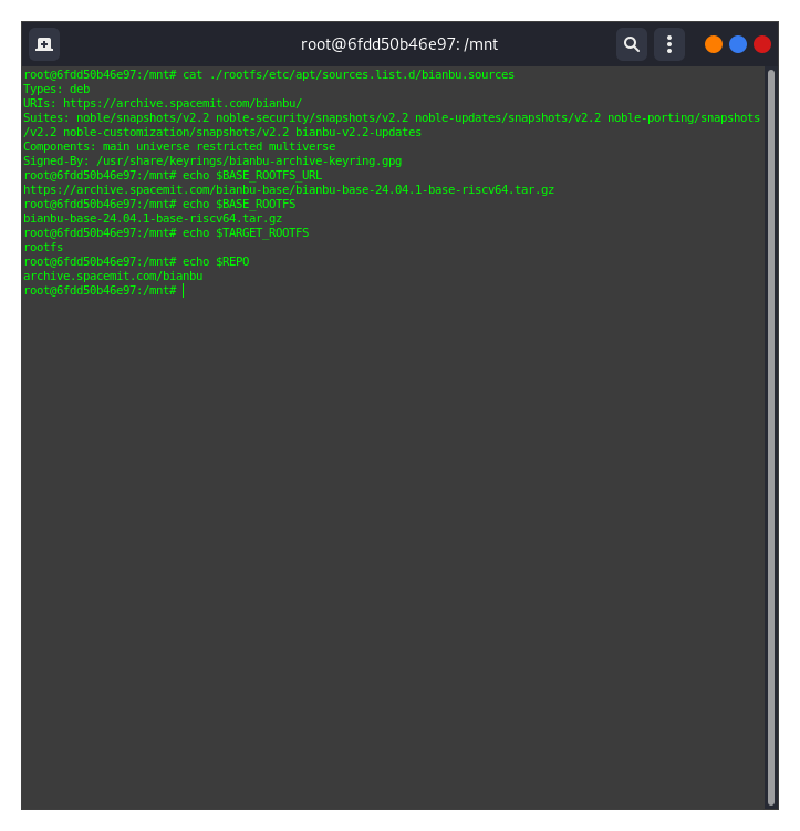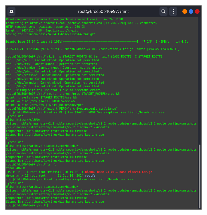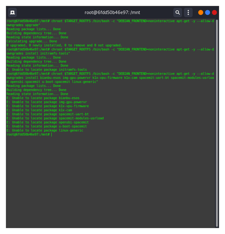 I’m trying to build rootfs according to the instructions on Ubuntu 24.04.3 LTS on x86 Arch, and when I try to chroot $TARGET_ROOTFS /bin/bash -c “DEBIAN_FRONTEND=noninteractive apt-get -y --allow-downgrades install bianbu-minimal” I get the following error - E: Unable to locate package bianbu-minimal !?
