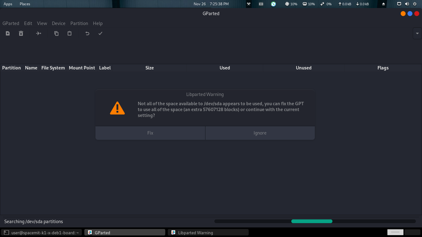 - I decided to check the file system table on the card. I ran sudo gparted and got this window