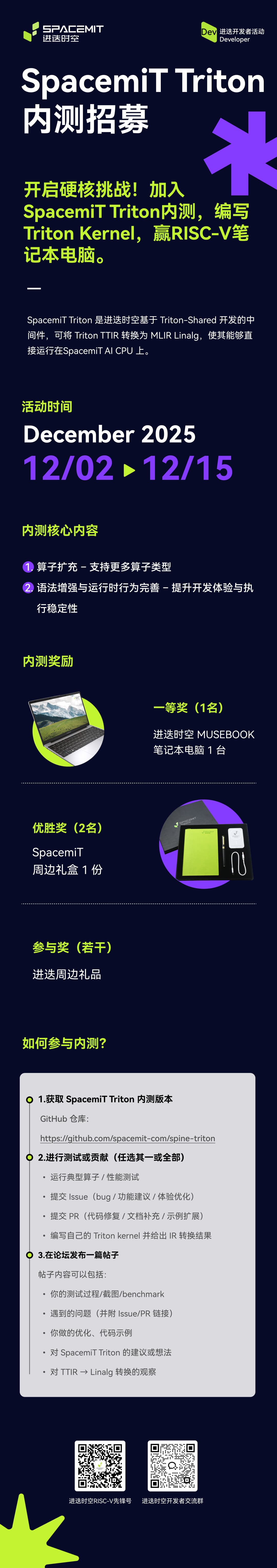 进迭开发者活动 | 开启硬核挑战!加入SpacemiT Triton内测,编写Triton Kernel,赢RISC-V笔记本电脑。