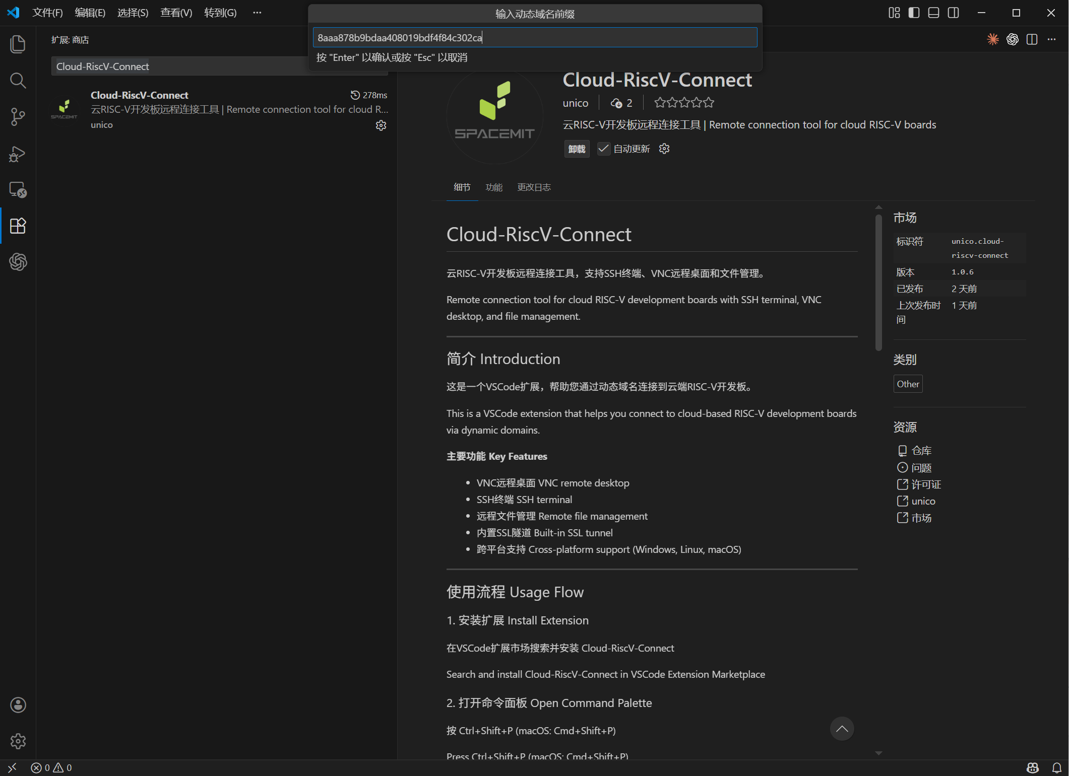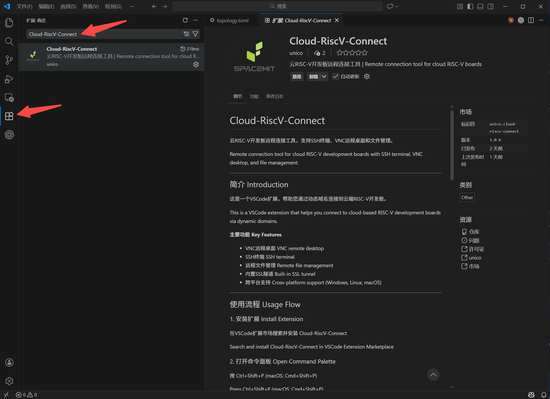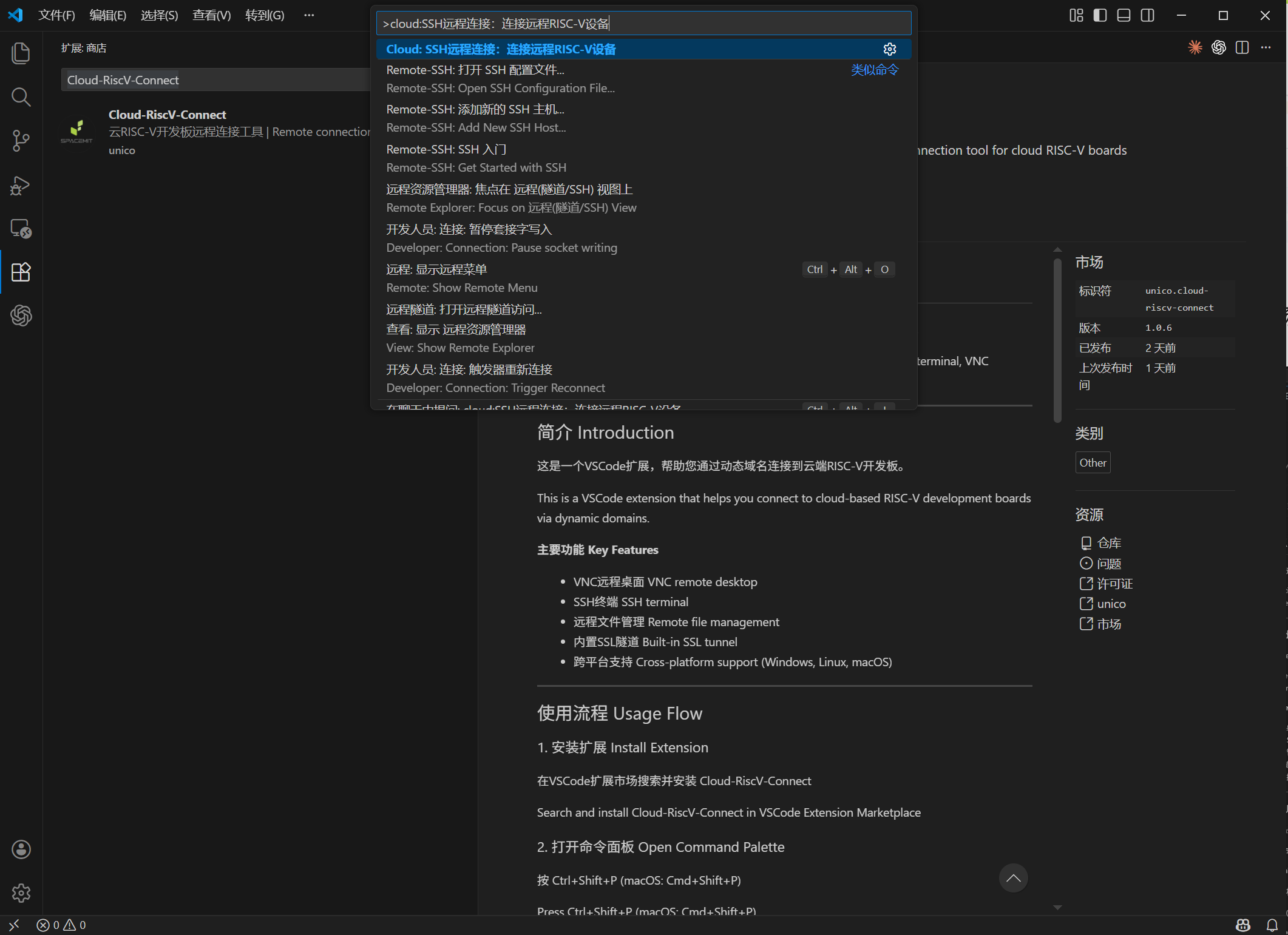 步骤3、进入Visual Studio Code扩展市场,搜索Cloud-RiscV-Connect插件下载安装