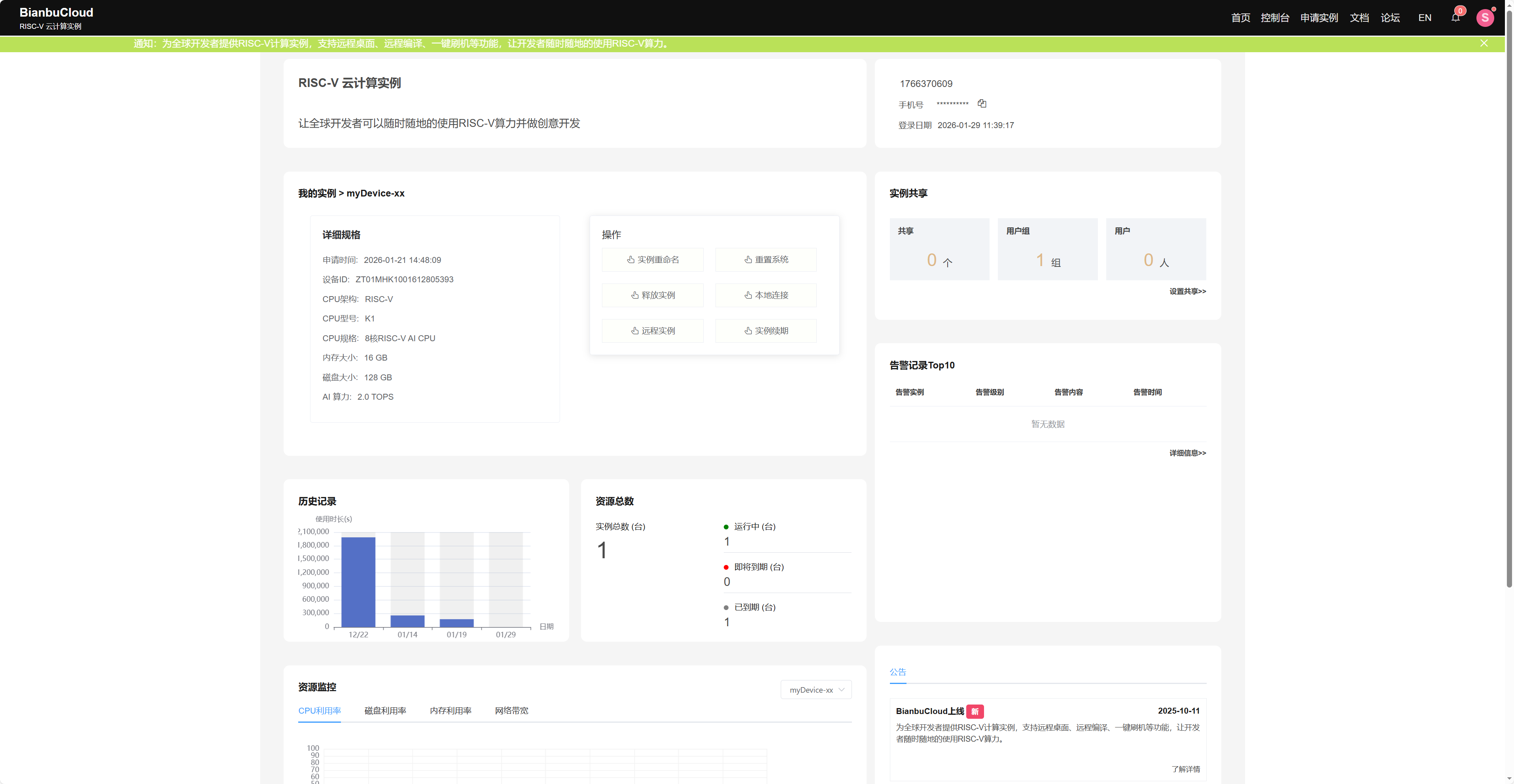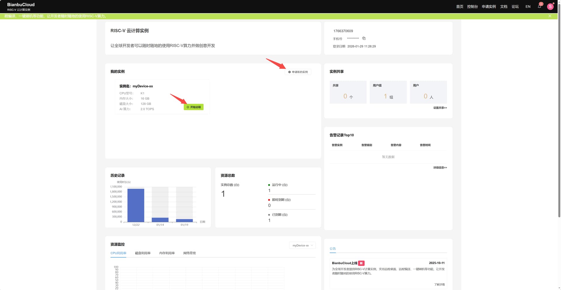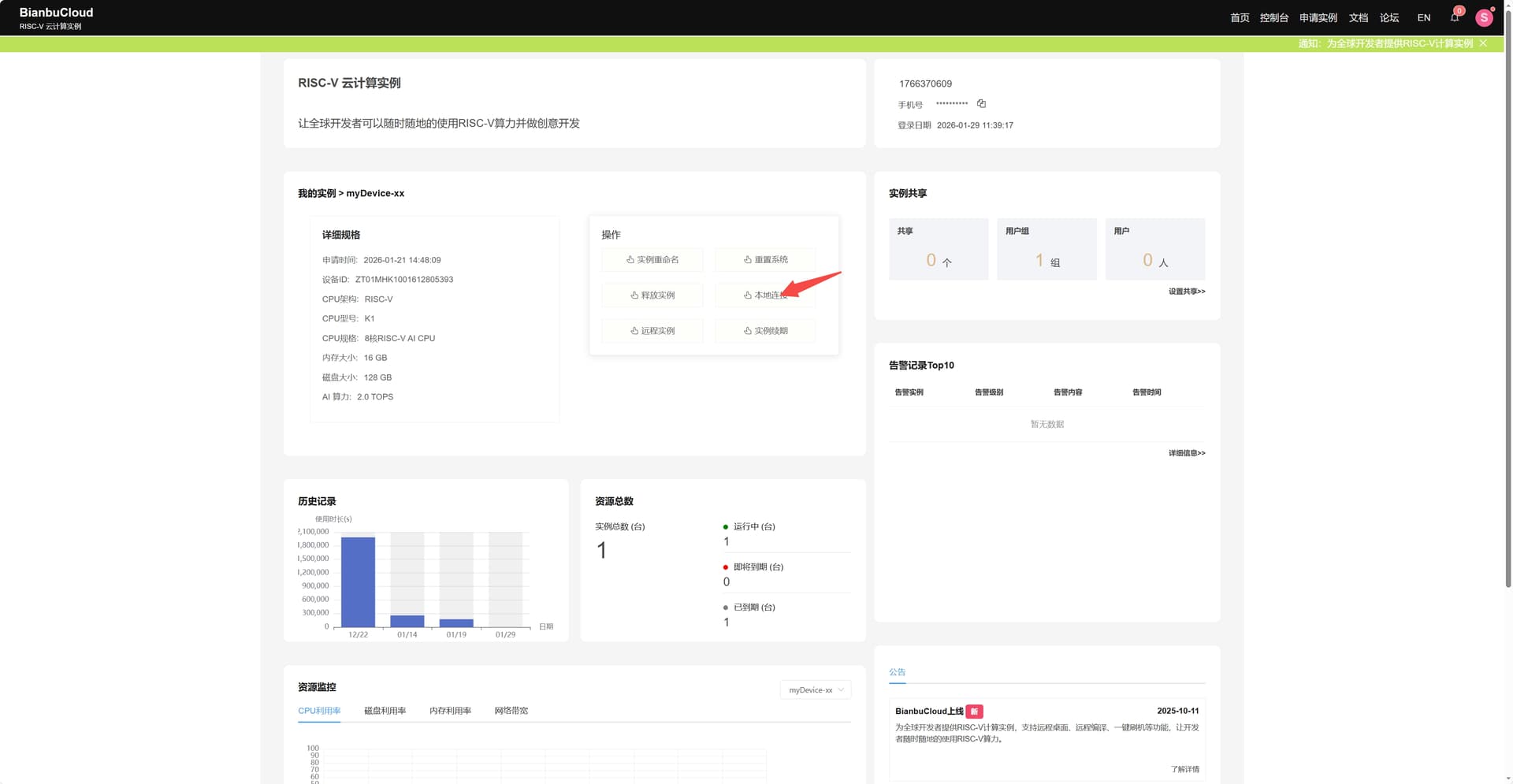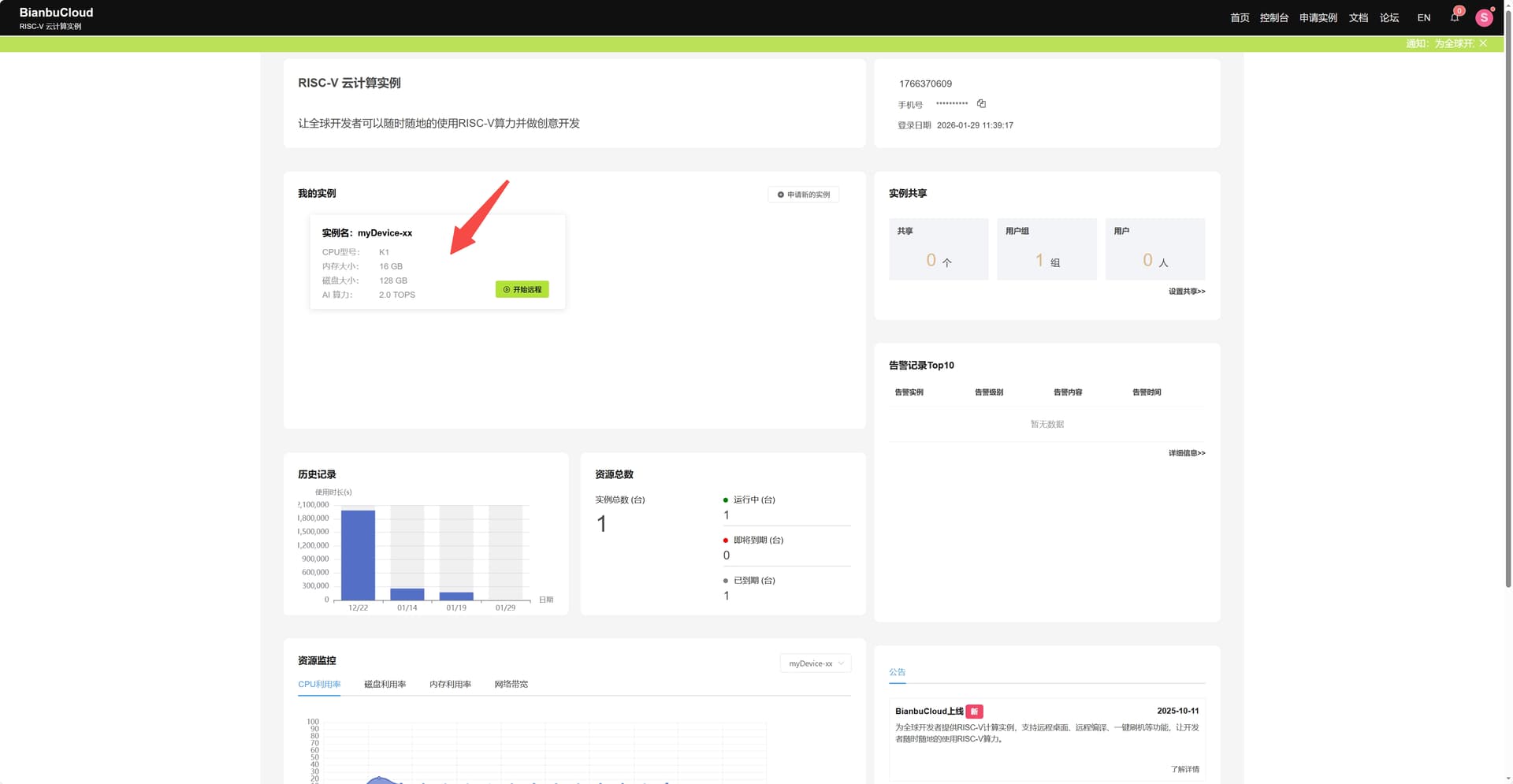 进入该界面,复制如红色下划线标注的BianbuCloud 为你的开发板实例动态生成的唯一子域名