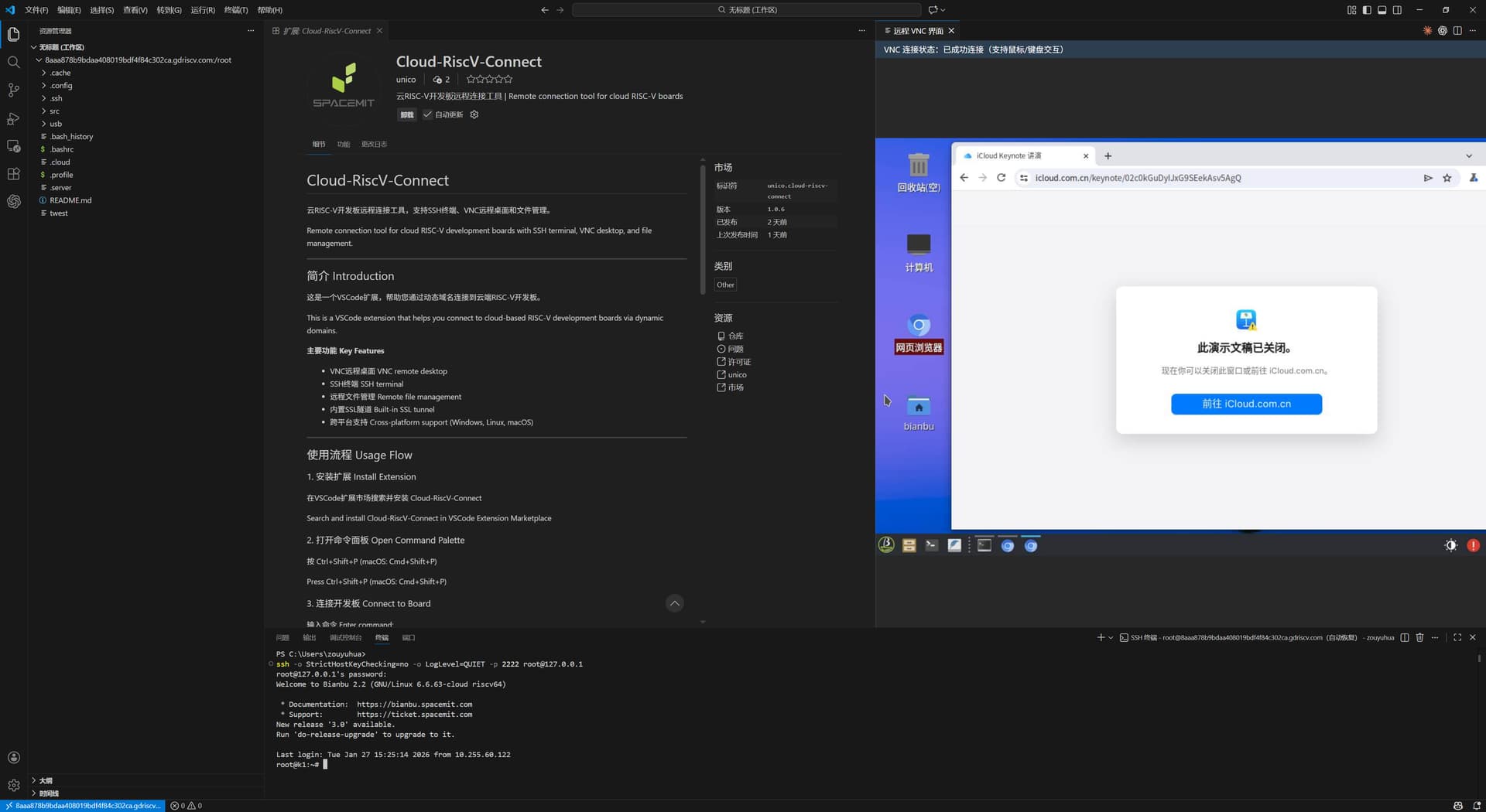 总结:该Visual Studio Code插件支持windows、linux、mac系统,windows系统在使用时,终端可能出现需要重新键入远程linux开发板的密码,输入密码:bianbu,即可连接远程终端