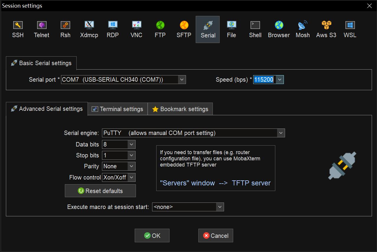 - 打开 “MobaXterm” 软件, 选择 Sessions → New Session, 在弹出的对话框中,选择 Serial。在 Basic Serial setting 里,Serial port 选择上图中识别到的对应 COM 口,Speed 速率选择 115200。