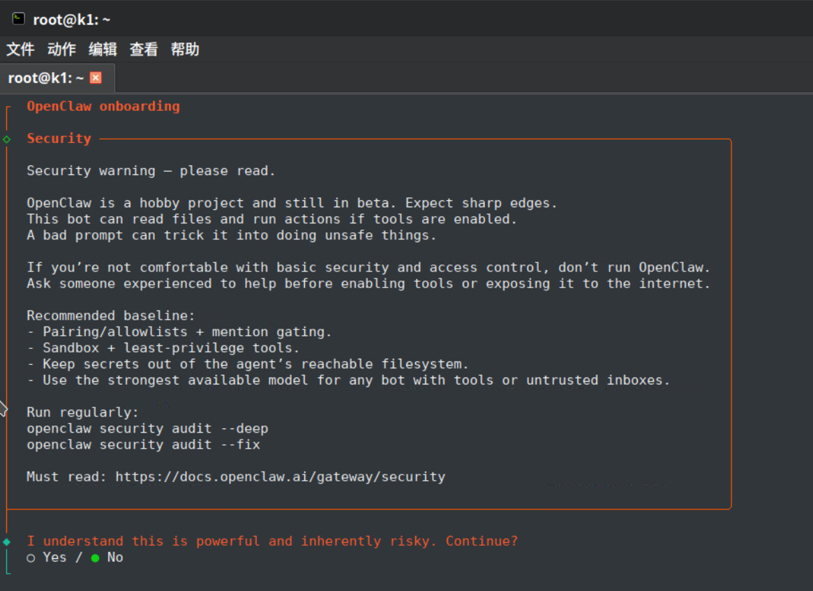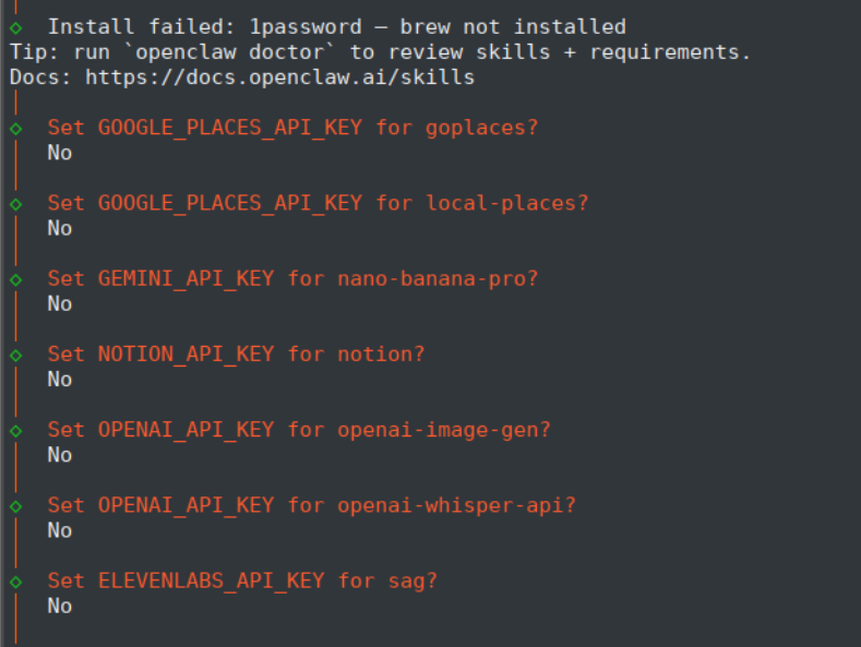 如果不知道先装什么,可先勾选 clawhub(空格勾选,回车安装)。