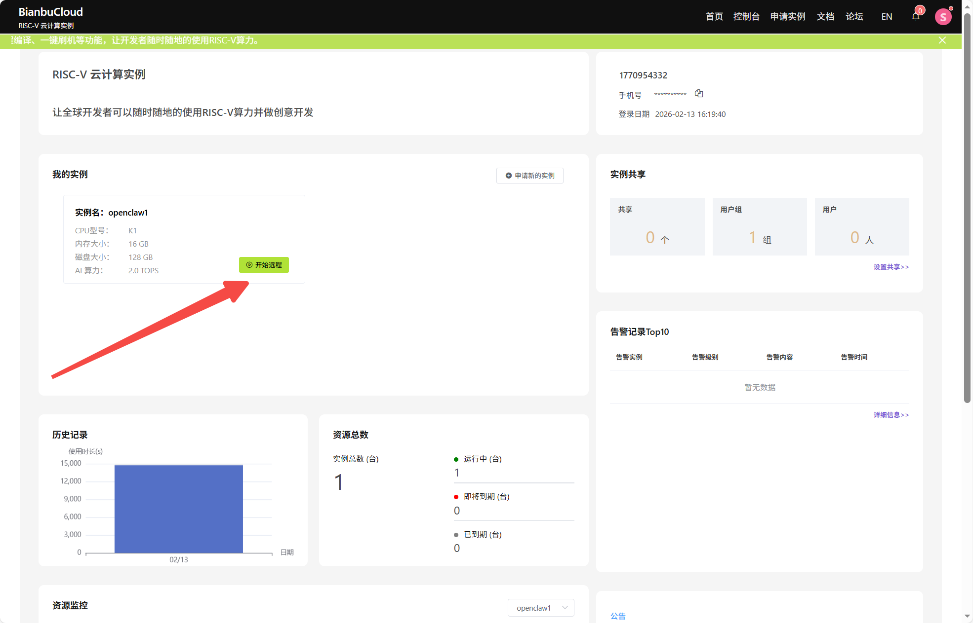 配置项 选择 实例创建方式 基于操作系统镜像 系统镜像 Bianbu v2.0rc2 区域 珠海-生态场 设备 K1 实例名 自定义 申请时长 48 小时 / 7 天 / 1 个月(自行选择) -